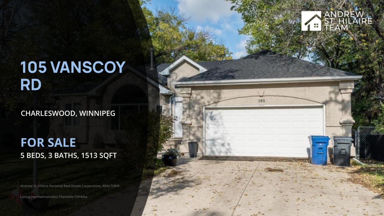 SS Oct 30 ll Offers as received AFTER Open House Nov 2 1pm-3pm ll Welcome to 105 Vanscoy Road-a stunning Charleswood bungalow perfectly positioned near the Harte Trail and surrounded by mature trees. Step inside to soaring 12-ft cathedral ceilings, large arched windows, and a bright open layout designed for modern living. The central three-sided gas fireplace adds warmth and style, seamlessly connecting the dining area and spacious living room. The crisp white kitchen features stainless-steel appliances, integrated gas cooktop, ample cabinetry, and expansive windows overlooking the private, tree-lined yard. The split-plan layout offers a private primary suite with ensuite and walk-in closet, while two additional bedrooms sit on the opposite wing. Downstairs, the recently redone basement adds generous living space with a media room, large home office, and guest rooms (windows may not meet egress). Enjoy the three season screened-in sunroom for relaxation and a fully fenced, low-maintenance backyard (even has leaf guards!). Double attached garage, new appliances (2024), and a quiet, family-friendly location close to parks, schools, and community trails make this home a rare Charleswood gem!