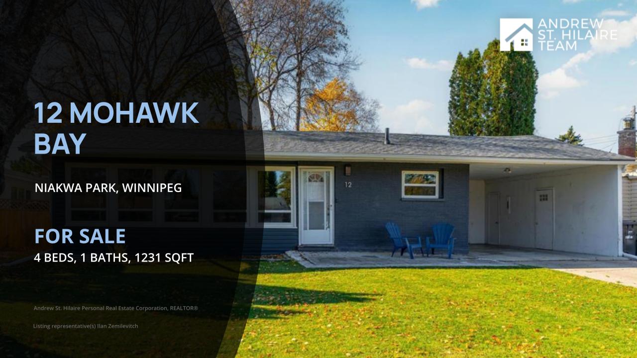 OTP 11/04 | OPEN HOUSES Thursday 6-8PM Saturday & Sunday 12-2PM | Welcome to 12 Mohawk Bay, a stunning, move-in-ready bungalow nestled on a quiet bay in the sought-after Niakwa Park. Built in the mid-1950s, this Park-style neighborhood caught the attention of Canadian Architect Magazine and it's easy to see why. The moment you walk in, Natural light floods the open-concept living space. New LVP flooring flows seamlessly throughout, leading you to the updated kitchen featuring quartz countertops, custom maple cabinets, and stainless steel appliances. The main floor is complete with three generously sized bedrooms and a beautifully renovated four-piece bathroom. Downstairs, you'll find a cozy rec room, a fantastic primary bedroom, and plenty of storage space for all your needs.Plus, a spacious 21'6" x 11'8" enclosed room tucked behind the carport, ready to become your workshop, creative studio, storage solution, or quiet escape. Recent Upgrades: LVP Floors '19, Furnace and HWT '19, Roof '18, Central A/C '20, Windows '18, New electrical panel '18, plus more! This move-in-ready gem is a rare find in one of Winnipeg's most desirable neighborhoods. Don't miss it!