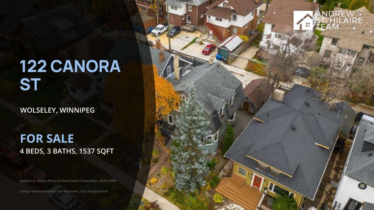 OPEN HOUSE SUN DEC. 7 FROM 2-3:30 PM.Welcome to 122 Canora Street a rare & beautiful Wolseley character home tucked between Wolseley & Westminster, surrounded by the warmth of a true community. From the moment you arrive, the gambrel roof, bay windows, & mature trees set the stage for a life well lived. Enjoy morning coffee on the front deck before stepping inside to a bright living room w a turret-style bay window, flowing into a dining room w beamed ceilings, pocket doors, a piano window, & stunning hardwood floors. The updated kitchen makes cooking a joy, while the screened-in sunroom is perfect for summer evenings with friends. Upstairs, a spacious primary suite (which could be converted back into 2 rooms) pairs w two bedrooms, a water closet, & a spa-like bath with soaker tub & separate shower. A must-see highlight is the 2nd-floor balcony a peaceful perch in the treetops. Downstairs offers a finished basement w bedroom, bath, storage, & updated boiler. Outside, a wide yard w stone patio, garage, & parking pad adds convenience the back lane is a feature, home to the beloved Back Alley Arctic art walk where creativity & community meet right at your doorstep.