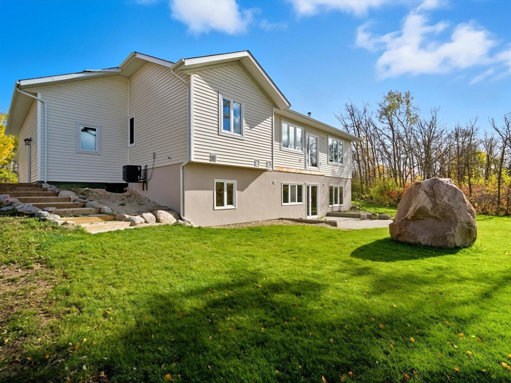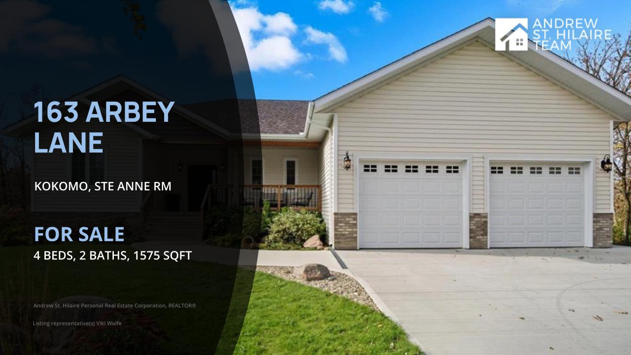 Open house October 18 from 1 pm to 3 pm. Showings start immediately. Offer date October 22nd. Welcome to this 1,575 sq ft raised bungalow with a 9-ft walk-out basement, just north of Kokomo Road, about 500 meters to pavement, and minutes from Steinbach, schools, shopping, hospital, golf course, and other amenities. Set on a private, treed 2-acre lot with natural elevation change and walking/quad trail to the back, this rare home features an open-concept bright white kitchen with walk-in pantry and mudroom. The primary suite includes an ensuite with walk-in shower and walk-in closet. Two additional bedrooms and a full bath complete the main floor. The basement is partially finished with walls taped, mudded, and primed, includes a 4th bedroom painted with flooring installed, and has a wood-burning fireplace that also provides heat to the upper level. Exterior highlights include front porch, stone patio, double garage with oversized doors and rear work area, woodshed, and shed with small dog run. Homes in this area rarely come up for sale.