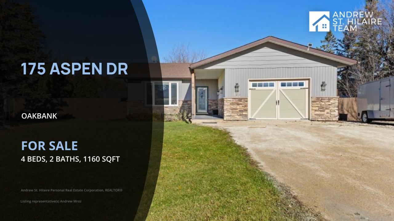 Showings Start Nov 7th Afternoon. Offers Reviewed Nov 13th @ 6pm. OPEN HOUSE Nov 9th 12-1:30pm. Welcome to 175 Aspen Drive in the heart of Oakbank! This well-maintained 1,160 sq ft bungalow sits on a sprawling 100' wide lot and offers the perfect combination of comfort, updates, and family-friendly living. The main floor features a bright and functional layout with hardwood flooring, an updated kitchen complete with stainless-steel appliances, and spacious living/dining areas. The garden door leads to screened in area, and large backyard that's great for entertaining and kids play space. Three bedrooms and a full bath complete the main level. Downstairs, you ll find a fully finished lower level offering a large rec room, fourth bedroom, full bathroom, and plenty of storage, perfect for guests or growing families. Outside, enjoy the mature lot with ample yard space and an oversized attached single garage, and plenty of parking space. Updates include shingles, HWT, NG furnace, water softener, and spray-foamed foundation walls, offering peace of mind for years to come. Located in a quiet, desirable area of Oakbank. Close to schools, parks, and amenities. This one checks all the boxes for family living!