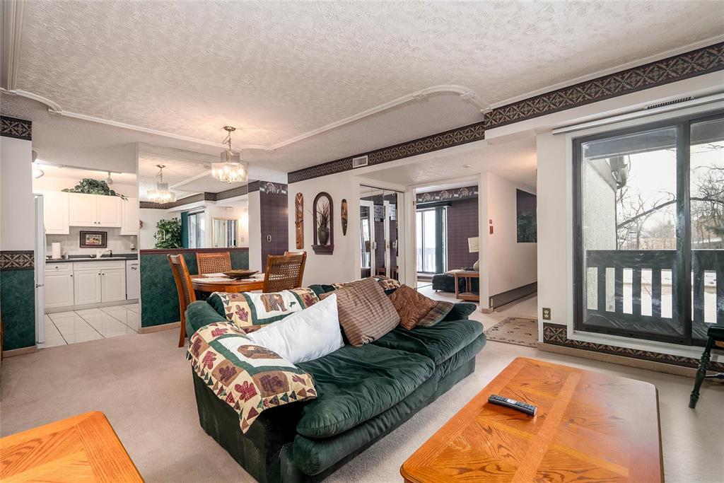 S/S 25/2. Offers Anytime after OH on Sunday 01/03 4pm. Welcome to Tuxedo Village! This well-designed second-floor condo features 2 bedrooms and 2 bathrooms with a layout that makes everyday living comfortable and convenient.The bright kitchen connects effortlessly to the spacious living and dining area, complete with a classic brick fireplace (Not Usable) and patio doors opening to one of two private balconies, ideal for morning coffee or evening downtime. A separate family room offers extra flexibility for a TV space, office, or hobby area, and also provides access to the second balcony.The generously sized primary bedroom easily accommodates a king-sized bed and workspace, and includes a 2-piece ensuite, in-suite laundry, and added storage. A second bedroom and full 4-piece bathroom round out the suite, perfect for guests, family, or a home office.Enjoy access to the outdoor pool, community garden boxes, and the ease of condo living with no snow shovelling or grass cutting. Two parking stalls complete the package.