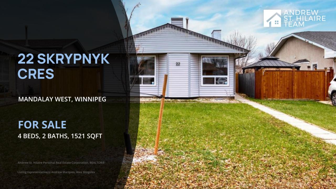 Showings start Nov. 14, 2025. Offers Nov. 21, 2025.Welcome to 22 Skrypnyk Crescent. This beautifully renovated 4-level split in prime Maples location. Bright, modern home features an open-concept main floor with updated flooring and lighting, along with a gorgeous kitchen complete with quartz counters, tile backsplash, and luxury appliances. The living and dining areas offer excellent space for everyday family life and entertaining. The upper level includes 3 bedrooms, including a generously sized primary bedroom, along with a fully remodelled bathroom. The lower level offers a large family room space for watching the next Jets game, along with an updated additional bedroom and a remodelled bathroom. The basement level opens into a large rec area perfect for a home gym, media room, or relaxed entertainment space. Renovations throughout include new lighting, fixtures, flooring, refreshed bathrooms, and more. With a large fenced yard, ideal for gatherings, kids, and pets. Close to schools, parks, shopping, and transit. A move-in-ready home in a fantastic Maples neighbourhood!