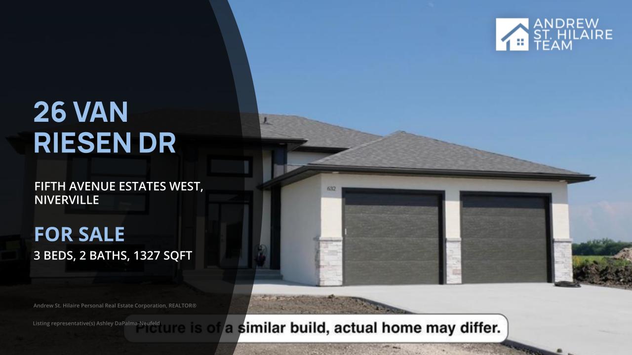 Welcome home to 26 Van Riesen Drive! A perfect blend of quality craftsmanship, modern design and peaceful country living. With 3 spacious bedrooms 2 full bathrooms and an open airy layout, this home is sure to capture your heart. All from a builder known for excellence and trust. This home delivers quality throughout! Highlights include a bright and spacious open-concept main living area which is perfect for everyday living and entertaining. Large windows that bathe the space in natural light and frame the stunning country views. A roomy double attached garage for all your parking and storage needs. A stylish modern kitchen with quartz countertops and tile backsplash that flows effortlessly into the dining and living room. The living room features a beautiful entertainment unit with electric fireplace. Comfortable bedrooms, including a primary suite with its own full bath. Striking front exterior with stone & timber accents that is sure to impress! This home is as functional as it is beautiful. Offering the charm of a quiet rural backdrop with the comfort of a thoughtfully designed interior. Don't miss the chance to make this charming Niverville home yours. Finishes may vary photos of similar home.