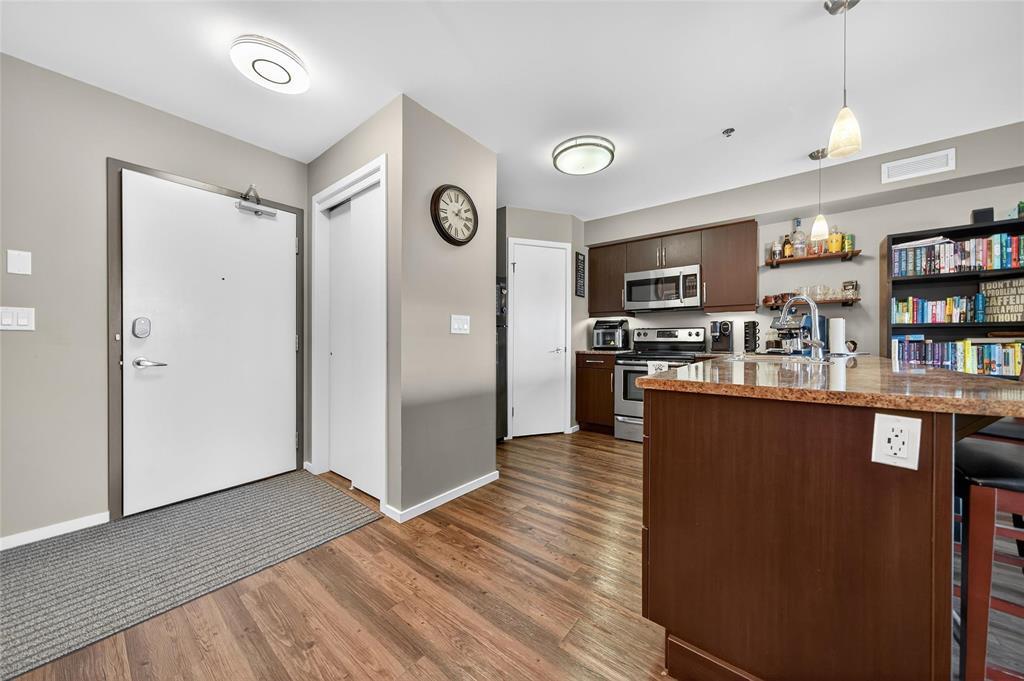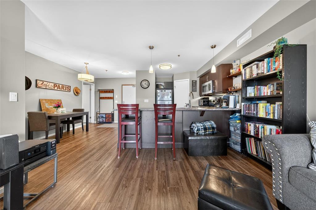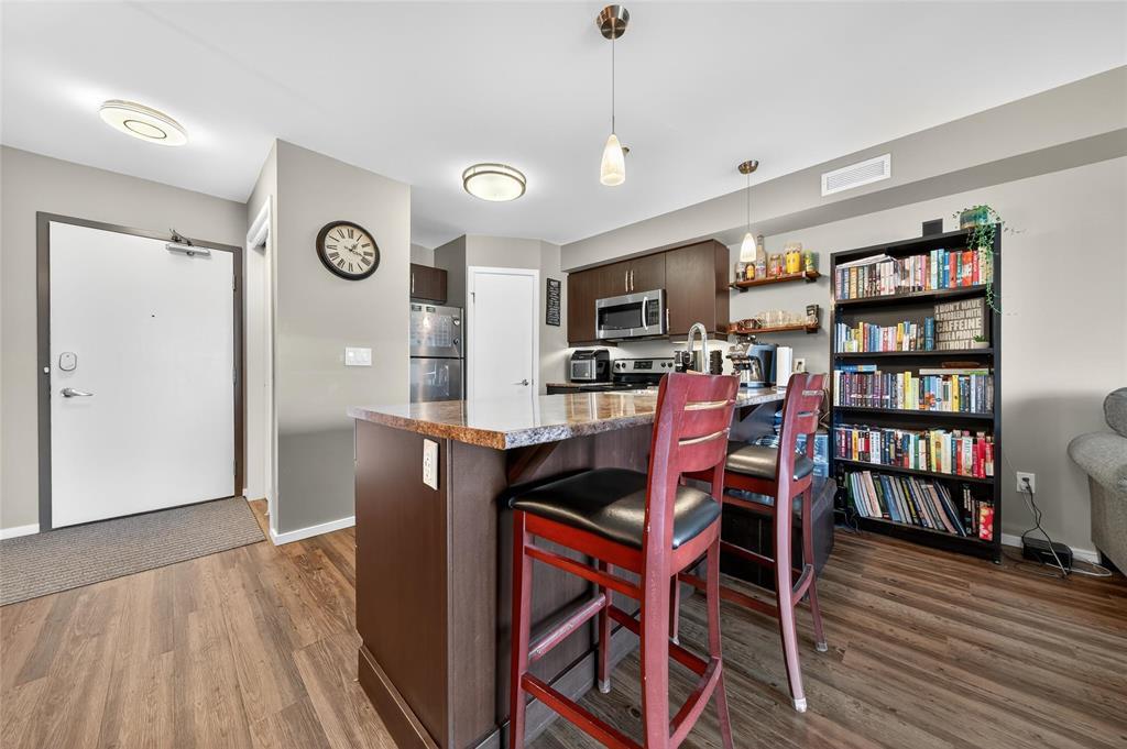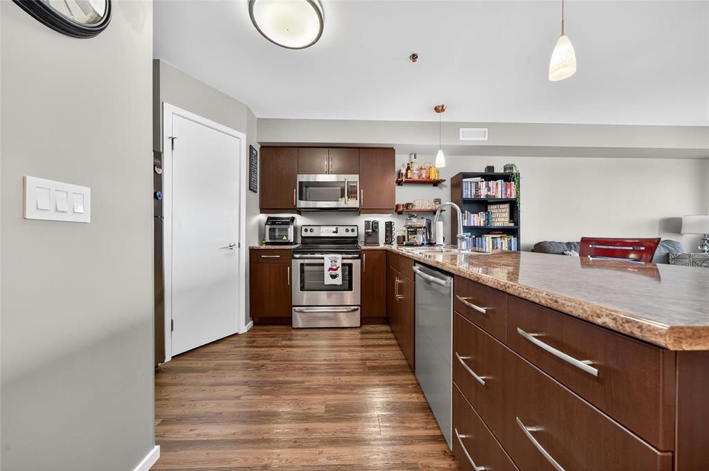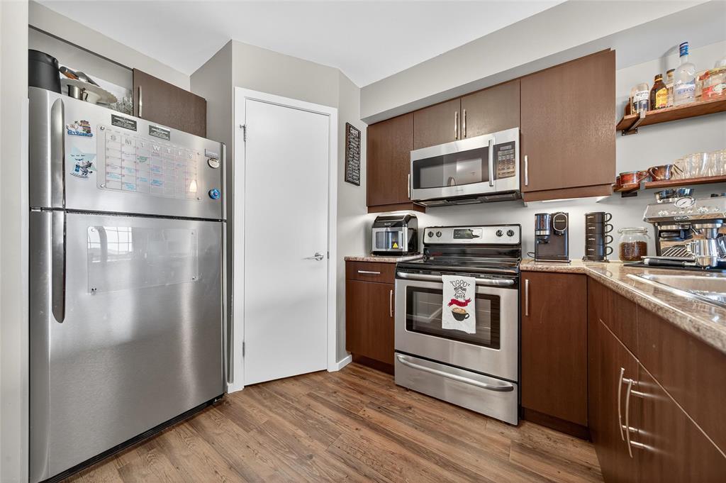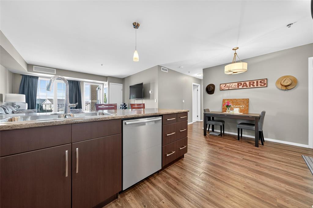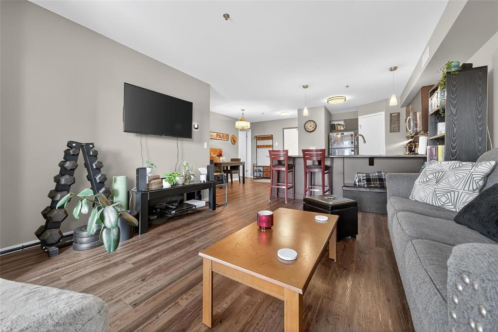 Discover this stylish 1-bedroom, 1-bath condo with serene views of Bridgwater Forest, offering 760 sq ft of bright, open-concept living. The expansive kitchen is highlighted by a large island, stainless steel appliances, and new wooden shelving, blending function with modern charm. A sun-filled living room with direct access to a private balcony creates the perfect space to unwind while enjoying the treetop views. Vinyl plank flooring flows seamlessly throughout the main living areas, enhanced by new LED lighting for a fresh and modern touch. The spacious primary bedroom includes a double closet, while the 4-piece bathroom and in-suite laundry with extra storage add convenience. Recent upgrades include a new hot water tank (2024) and an Ecobee smart thermostat for energy efficiency. This condo also offers heated underground parking, secure entry, and access to amenities such as a fitness room and party room. With condo fees covering all utilities, you ll enjoy unbeatable value and worry-free living. Ideally located close to the University of Manitoba, shopping, schools, and public transportation, this is the perfect combination of comfort and convenience. Book your private showing today!