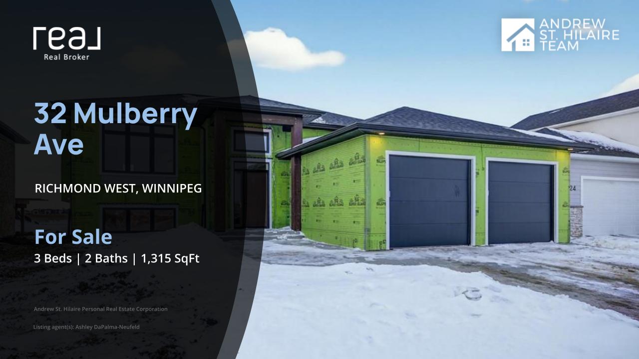 Welcome home to 32 Mulberry Avenue! A perfect blend of quality craftsmanship with modern design backing onto a greenspace. With 3 spacious bedrooms 2 full bathrooms and an open airy layout, this home is sure to capture your heart. All from a builder known for excellence and trust. This home delivers quality throughout! Highlights include a bright and spacious open-concept main living area which is perfect for everyday living and entertaining. Large windows that bathe the space in natural light and frame the stunning country views. A roomy double attached garage for all your parking and storage needs. A stylish modern kitchen with quartz countertops and tile backsplash that flows effortlessly into the dining and living room. The living room features a beautiful entertainment unit with electric fireplace. Comfortable bedrooms, including a primary suite with its own full bath. Striking front exterior with stone & timber accents that is sure to impress! This home is as functional as it is beautiful. Offering the charm of a quiet rural backdrop with the comfort of a thoughtfully designed interior. Don't miss the chance to make this charming Niverville home yours. Finishes may vary photos of similar home.