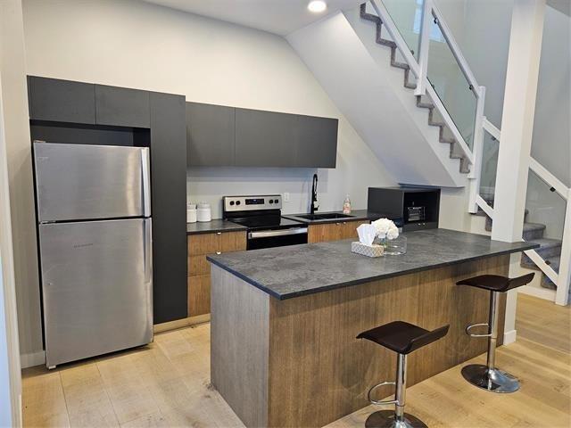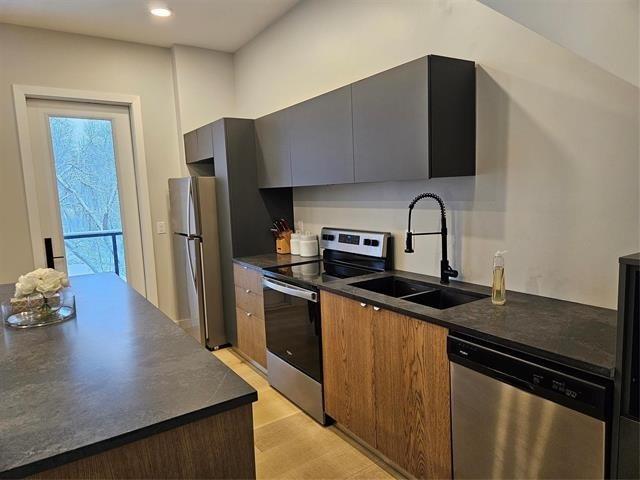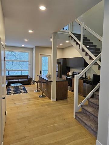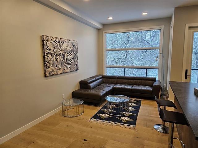 Riverfront! Modern open-concept 3-bedroom, 2.5-bath home with two balconies offering breathtaking views of the river and a golf course. The stunning main floor features an open layout with the living room, custom Italian kitchen by M-Concept .The custom dual-tone kitchen boasts quartz countertops and stainless-steel appliances. High-end finishes include beautiful engineered hardwood flooring and large porcelain tiles throughout. Master bedroom overlooking the Seine River, Custom tile shower plus a walkout balconies to enjoy the lush greenery. The home has 9-foot ceilings and a gorgeous glass staircase leading to the owner's suite, which has its own deck access and a full ensuite. A cozy reading nook with massive windows and an abundance of mature trees complete this picturesque property.