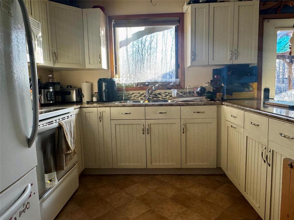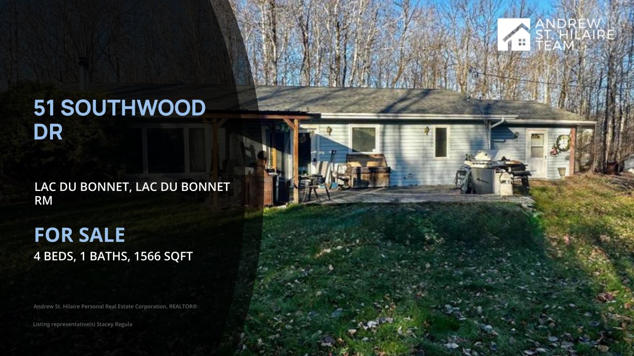 1.62 acres just 5 minutes south of Lac du Bonnet! This 1,566 sq.ft., 4-bedroom, 1-bath home offers space, privacy, and huge potential for the right buyer. Located on the desirable Southwood Drive, the property features an open-concept layout with a large living room, dining area, and kitchen overlooking the private treed yard. The home received kitchen & bath updates in 2013, including newer cabinets, updated countertops, backsplash, flooring, and a refreshed 4-pc bath. Garden doors off the dining room lead to the deck area and spacious yard. The living room features a wood stove and large windows with views of the expansive property. Additional features include a large laundry room, large storage space/pantry & a 24' x 28' insulated garage. Outside offers mature trees, open space, and great potential for gardens, outdoor entertaining, or simply enjoying the peaceful setting. Services include: river water co-op ($20 a month), holding tank with grey water field, and electric heat. This property offers solid value for buyers willing to put in some work. This home is ready for you to make it your own. A great opportunity to create a year-round home or retreat near Lac du Bonnet.