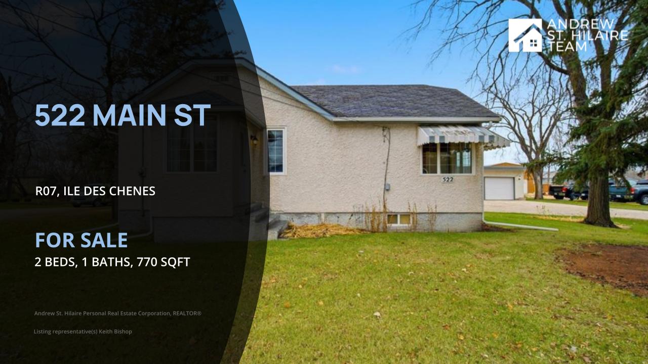Showings start November 17th. Offers as recieved. Welcome to 522 Main Street, located in the beautiful community of Ile Des Chenes. This charming 770 sq.ft. bungalow features 2 bedrooms, 1 full bathroom & a large 24' x 30' double detached garage. Situated on massive double lot with a 99' frontage by 200' trhis is the perfect home for a first-time buyer or someone looking to downsize. Upon entry you ar greeted with an spacious eat-in kitchen with an open floorplan to the living room. The main floor features a large primary bedroom with WIC, secondary beroom, 4-piece bath & updated PVC windows throughout allowing for an abundance of natural light to fill the space, creating an inviting atmosphere. The lower level has ample storage capaciy along with upgraded mechanical. Terrific opportunity to getr into a great community at an affordable price! Call today to book your showing.