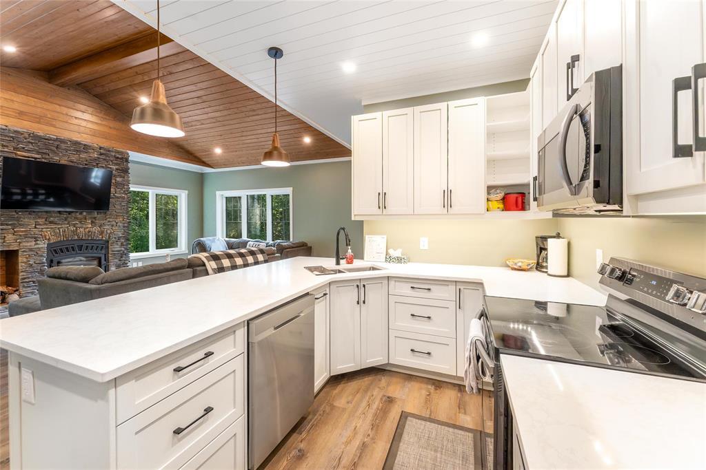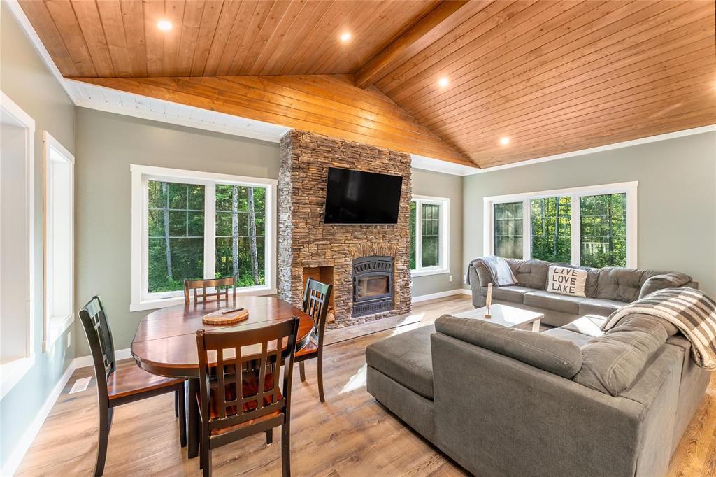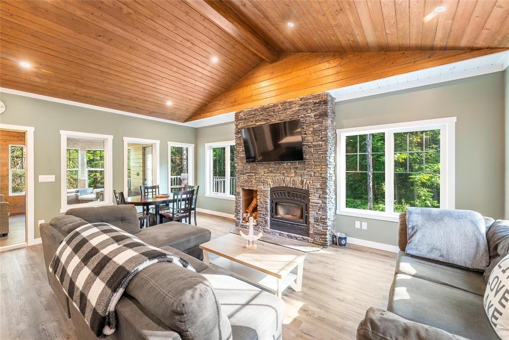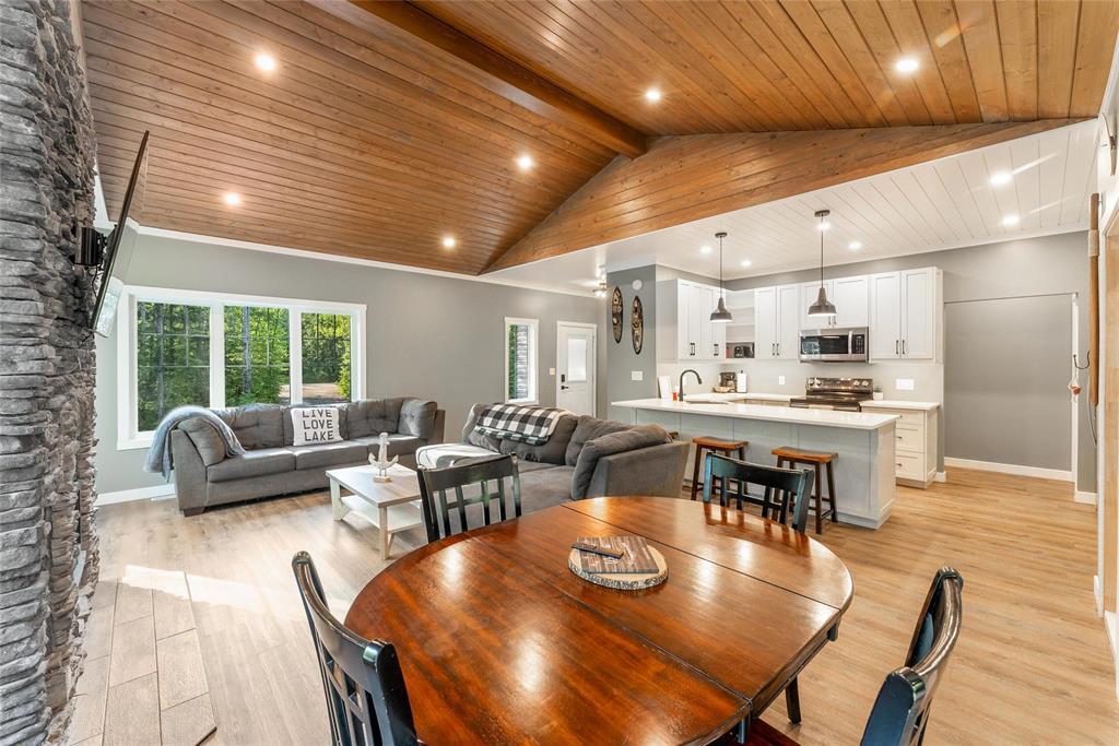 SS 04/07/26. Welcome to the much sought-after neighborhood of Granite Hills. This beautiful 1200sft 4-season Home/Cottage is located on over a 1/2-Acre, nicely treed, private lot with 3 Bedrooms, 2 Bathrooms, an Open-Concept LR/DR/Kitchen, along with all of the conveniences and amenities of home. Walk in to the large front entryway and immediately feel relaxed in this year-round retreat. Chill out in the combined Living-room & Dining-room that offers a modern, yet rustic design and vaulted ceilings. Cozy up to the wood-burning fireplace and enjoy a movie. The contemporary Eat-In Kitchen boasts quartz countertops, plenty of cabinetry, a built-in wine-rack and 4 SS appliances. Sit out in the 3-season Sunroom surrounded by views of nature without the bugs, or head out the garden door and have a BBQ out on the composite back deck. Gather around the outdoor fire-pit area in your very own park-like setting. The spacious Primary Bedroom has a 3-pc Ensuite w/sleek walk-in shower. 2 more good-sized Bedrooms down the hall, along with 4-pc Bath & Laundry/Storage room. Walking distance to Marina, Boat launch, Golf course, General Store, Restaurant, Gas Station and beach area. Dock slips available. Co-Op water.